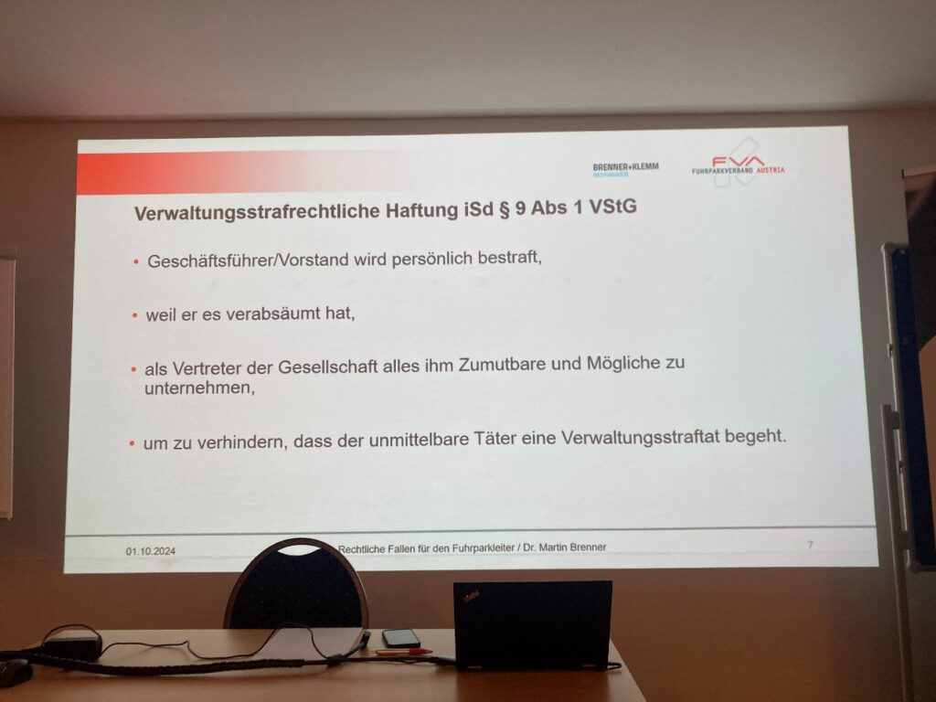 Bei einem Vortrag Anfang Oktober referierte der FVA Verbandsanwalt Dr. Martin Brenner in Wien vor zahlreichen Mitgliedern über dieses meist unterschätze Thema in Unternehmen. Nicht nur Fuhrparkleiter, sondern auch die Mitglieder der Geschäftsleitung der Mitgliedsunternehmen waren geladen. Die rechtlichen Belange im Zusammenhang mit einem Fuhrpark sind umfangreich und die Haftung für die Einhaltung liegt bei der Geschäftsleitung (Management). Zielsetzung des Vortrages war einen Überblick über Haftungsfragen im Zusammenhang mit dem Fuhrpark zu geben und über Schutzmaßnahmen zu informieren, da die Judikatur in vielen Bereichen keine klaren Aussagen trifft.
